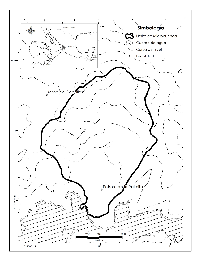 El área de estudio es la microcuenca Potrero de la Palmita, la cual se ubica al oeste de la República Mexicana y forma parte del municipio del Nayar al este del Estado de Nayarit (Figura 1). La localidad más importante es Potrero de la Palmita, comunidad huichol (grupo étnico de la región centro-oeste de México) cercana a la desembocadura de la microcuenca (en la Presa Aguamilpa), sitio donde drena sus aguas al Río Huaynamota. Las vías de comunicación están constituidas por brechas y veredas.