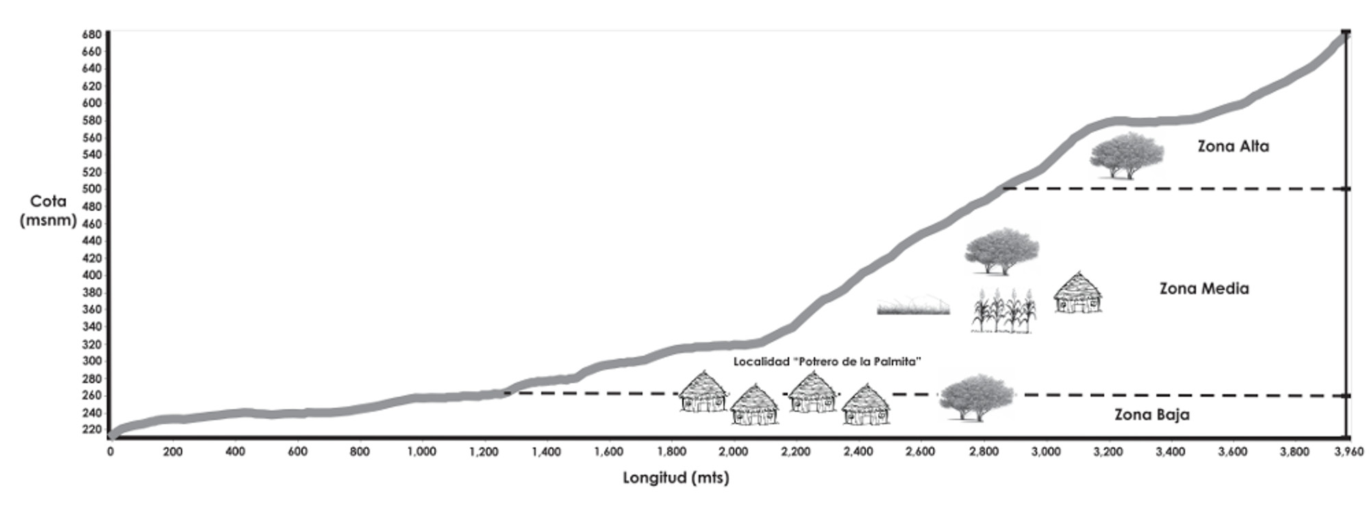 El análisis visual del perfil longitudinal del cauce principal y los órdenes de las corrientes conforme el cambio altitudinal (Figura 4) permitió detallar los límites de las zonas funcionales en la microcuenca, siguiendo principalmente los cambios abruptos en el cauce del río y la presencia de nuevos órdenes. Todo ello resultó en una re-delimitación de las zonas funcionales; zona alta a partir de los 500 msnm, la zona media de los 500 a los 260 msnm, y la zona baja por debajo de los 260 msnm.