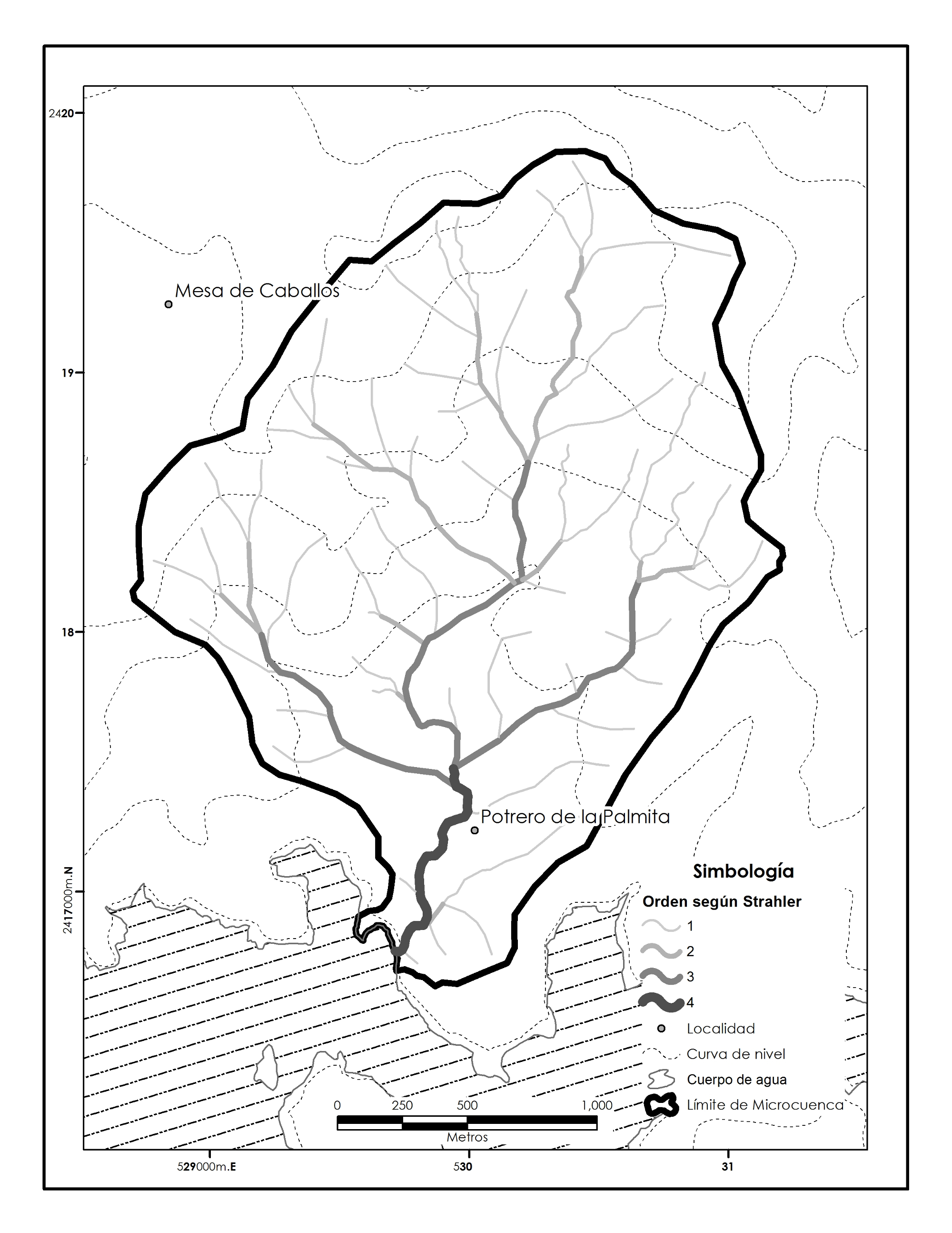 La morfometría de la microcuenca se obtuvo mediante ecuaciones estándar que se aplicaron con base en la delimitación de la microcuenca, así como de las corrientes intermitentes y efímeras obtenidas de las curvas de nivel a cada 5 metros (Tabla 1).