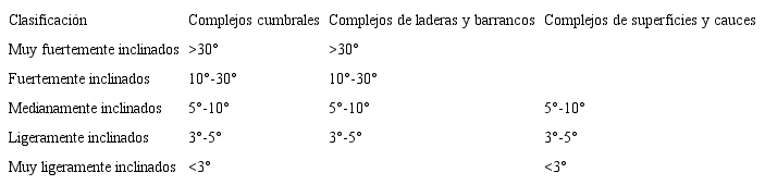 Las geoformas anteriores presentan cinco rangos de pendientes con valores que van de <3°, clasificándose como muy ligeramente inclinados, valores de 3° a 5°, clasificados como ligeramente inclinados, valores de 5° a 10°, clasificados como medianamente inclinados, valores de 10° a 30°, clasificados como fuertemente inclinados y valores >30°, clasificados como muy fuertemente inclinados.