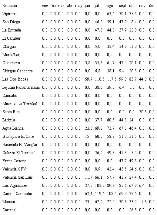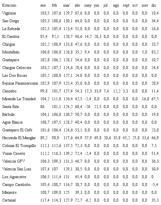 Estas estaciones se seleccionaron por poseer un período común de 30 años de registro histórico que va desde 1969 hasta 1999; este lapso de tiempo incluye el mayor número de estaciones con registros completos del estado Carabobo, de acuerdo con lo sugerido por la Organización Meteorológica Mundial (OMM, 2011). Los datos englobados se calcularon con las fórmulas de desenglobe mensual y los faltantes se estimaron a través del Método Estadístico de Regresión (Guevara, 2013).