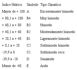 En función a lo señalado anteriormente, Thornthwaite (1948) propuso una metodología para que los climas se ordenen de acuerdo al grado de humedad, al tomar en cuenta las necesidades hídricas de los cultivos (evapotranspiración); y con los resultados del Balance Hídrico Climático (BHC): excesos y déficits, se determina el índice hídrico (Im), mismo que permite agrupar el clima en una de las clasificaciones más usadas a nivel mundial