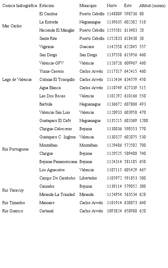 Se utilizaron los datos mensuales de precipitación de 25 estaciones Convencionales Pluviométricas (CP) ubicadas en el estado Carabobo, provenientes del Banco de Datos de la Gerencia de Procesamiento y Calidad de Datos del Instituto Nacional de Meteorología e Hidrología (INAMEH) (Tabla 1).
