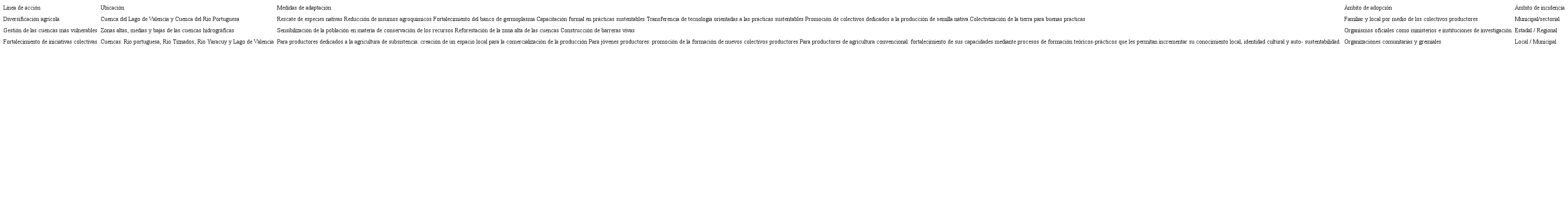 Ante este panorama, surgen las líneas de acción y medidas de adaptación en la agricultura como actividad climáticamente sensible, enfocadas a impulsar los cambios en los sistemas de bienes alimentarios (producción y almacenaje de alimentos básicos e insumos agrícolas y su comercialización); cambios en las actividades de los sistemas de alimentos (la forma de producción, almacenaje, consumo y distribución) y por último, cambios en los componentes de seguridad alimentaria (disponibilidad, acceso, utilización y estabilidad de los alimentos).