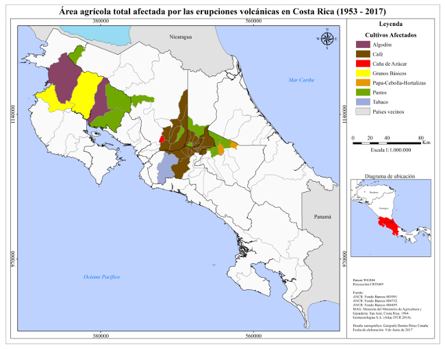 Abstract: This article explains, from a historical perspective, the eruptive activity of the volcanoes in Costa Rica and its impact on agriculture and livestock during the period 1950-2017. Specifically, the research analyzes how the "showers of ash" and gases expelled by the massifs affected the livestock sector and the crops of cotton, maize, rice, potatoes, and coffee, among others. The study is based on bibliographic documentation and primary sources available at the National Library, the National Emergency Commission (CNE), the National Archives of Costa Rica (ANCR), the Ministry of Agriculture and Livestock (MAG), the National Seismological Network (RSN), and the Costa Rican Volcanological and Seismological Observatory (OVSICORI).