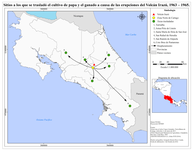 En contraste con estas medidas, un grupo de productores prefirió migrar a regiones del país que experimentaron poca o nula afectación por la expulsión de materiales volcánicos. En algunos de los casos el traslado se dio de manera temporal, mientras que en otros fue permanente. Solo por mencionar un evento, la fuerza de las erupciones del volcán Irazú (1963-1965) obligó a ganaderos y productores de papa y hortalizas a emigrar a zonas como Turrialba en la provincia de Cartago, Santa María de Dota en la provincia de San José, San Ramón en la provincia de Alajuela y San Rafael en la provincia de Heredia, tal y como se observa en el Mapa No. 4. Esto con el objetivo de continuar desarrollando sus actividades productivas en dichas zonas. Estos desplazamientos, si se quiere forzados, representaron para los productores agropecuarios la única forma de garantizar el bienestar económico y la seguridad de sus familias: