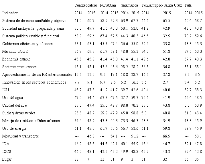 Si se fija el 2015 como año de referencia, Coatzacoalcos alcanzó el octavo lugar, superando a núcleos urbanos como Guanajuato, Guaymas, Colima y Los Mochis, lo cual es muy meritorio. Después de esta ciudad se ubicó Salamanca (posición 20), que incrementó su nivel de competitividad con relación a 2014 gracias a un buen desempeño en sistema de derecho confiable y objetivo, sociedad incluyente, preparada y sana, aprovechamiento de las relaciones internacionales e innovación en los sectores económicos. Simultáneamente, Salamanca mostró un nivel insatisfactorio en dos indicadores: sistema político estable y funcional, y sectores precursores. A continuación, aparece Minatitlán (lugar 22), cuyos registros, además de considerarse como promedio, se mantienen prácticamente estáticos. En tanto que Tehuantepec-Salina Cruz y Tula, cuyo desempeño se puede considerar como bajo (alcanzaron las posiciones 26 y 31, respectivamente), son las dos ciudades petroleras con menor ICU. Tehuantepec-Salina Cruz mantuvo en 2015 el nivel mostrado en 2014, en donde se observa un manejo adecuado en cuanto a sistema de derecho confiable y objetivo, y en aprovechamiento de las relaciones internacionales, a la vez que una gestión insatisfactoria en sistema político estable y funcional, junto a la innovación en los sectores económicos. Mientras que Tula disminuyó ligeramente su nivel de competitividad, con un manejo inadecuado de los siguientes indicadores: gobiernos eficientes y eficaces, mercado laboral, economía estable, aprovechamiento de las relaciones internacionales e innovación en los sectores económicos. En contraparte, muestra un buen desempeño en sistema político estable y funcional (ver Tabla 2).