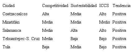 Los resultados generales, es decir, del ICCS, señalan que, por las causas comentadas atrás, Salamanca es la ciudad petrolera más competitiva y sustentable, ocupando los lugares nueve y tres, respectivamente, en los años 2014 y 2015 dentro de la Categoría C, lo que la ubica en los primeros lugares. En resumen, Salamanca es una localidad con un nivel medio de competitividad, un alto nivel de sustentabilidad y que despliega una tendencia global positiva (ver Tabla 3). Con base en lo explicado en párrafos anteriores, después aparece Coatzacoalcos, que en 2014 se ubicó en la posición 22 a nivel global y en 2015 logró el sitio número 7, lo que permite colocarla en el conjunto de ciudades líderes de la Categoría C. Así, Coatzacoalcos es una ciudad que muestra una tendencia favorable en sus indicadores, con un alto nivel de competitividad, y un nivel medio en lo correspondiente a sustentabilidad. Enseguida aparece Minatitlán, ciudad vecina de Coatzacoalcos, y que alcanzara el sitio 33 en 2014 y el 21 en 2015, lo que la ubica en una posición intermedia. El análisis realizado permite afirmar que Minatitlán es una urbe con niveles medios en competitividad y sustentabilidad ambiental, pero con una tendencia positiva. Después se ubicó la zona metropolitana de Tehuantepec-Salina Cruz que se instaló en lugares secundarios: 31 y 32, de manera respectiva, en los años 2014 y 2015 en el ICSS; como ya se observó, manifiesta un nivel medio en competitividad y bajo en sustentabilidad, aunque su tendencia es positiva. Finalmente, también en lugares bajos, se ubica la ciudad de Tula, cuya baja competitividad y sustentabilidad ambiental media, le ubican en los lugares 36 y 35, respectivamente, en 2014 y 2015, mostrando una tendencia también positiva, fundamentalmente por sus gestiones en materia ambiental.