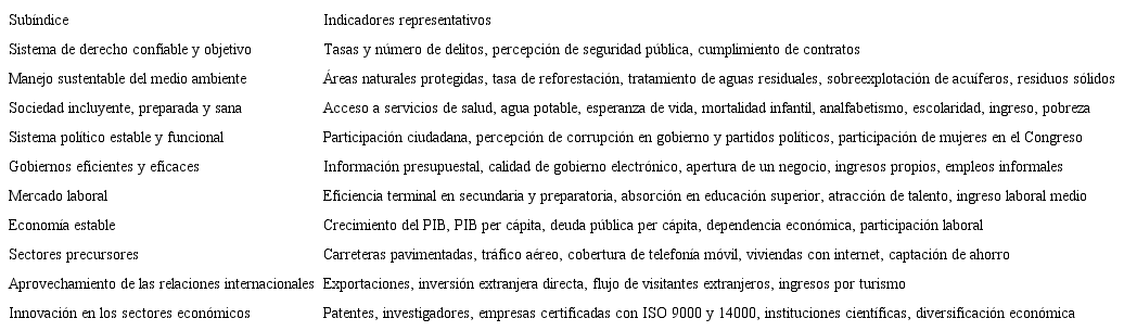 Un referente obligado para entender la competitividad de una ciudad o municipio, en una república federal como México, lo constituye la competitividad de la entidad federativa a la cual pertenece. Tal y como se puede constatar en el trabajo de Moreno (2008), con la de 2014 el IMCO ha presentado cinco ediciones del Índice de Competitividad Estatal (ICE), mismo que se conforma por 89 indicadores, agrupados en 10 subíndices, los cuales miden diferentes aspectos de la competitividad de las 32 entidades federativas que integran la república mexicana, fundamentalmente su capacidad para atraer y retener capital humano y proyectos de inversión (ver Tabla 4). Para fines de evaluación, el ICE otorga una calificación de 0 a 100 a cada estado por cada factor de competitividad y de manera global.