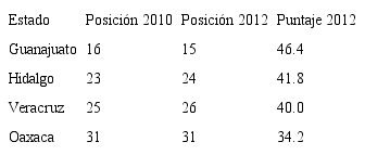 El ICE 2014 señala que entre 2010 y 2012, las entidades mejor posicionadas resultaron ser el Distrito Federal (nombrada por decreto, desde enero de 2016, como Ciudad de México), Baja California Sur, Aguascalientes, Nuevo León y Querétaro, mientras que las menos competitivas6 resultaron ser Guerrero, Oaxaca, Chiapas, Tlaxcala y Durango. En lo que concierne a las entidades federativas vinculadas a las localidades participantes en la presente investigación (ver Tabla 5), se observa que Guanajuato es la más competitiva, al ocupar el lugar 15 a nivel nacional, lo cual es consistente con el resultado a nivel ciudad, donde Salamanca resultó ser la mejor posicionada. Después de Guanajuato se ubicaron en lugares muy próximos Hidalgo y Veracruz (posiciones 24 y 26). Los resultados relativos en Veracruz guardan correspondencia con el análisis por ciudad, ya que después de Salamanca, las más competitivas y sustentables resultaron ser Coatzacoalcos y Minatitlán; no ocurre lo mismo con la ciudad representante de Hidalgo, ya que Tula es la ciudad petrolera con menor ICCS y registra además una de las notas más bajas a nivel nacional en su categoría. Finalmente aparece el estado de Oaxaca, el más rezagado en el estudio y uno de los menos competitivos a nivel nacional (lugar 31, sólo superando a Guerrero); lo que ocurre en esta entidad permite comprender, en buena medida, la insatisfactoria posición de Tehuantepec-Salina Cruz en materia de competitividad y sustentabilidad.
