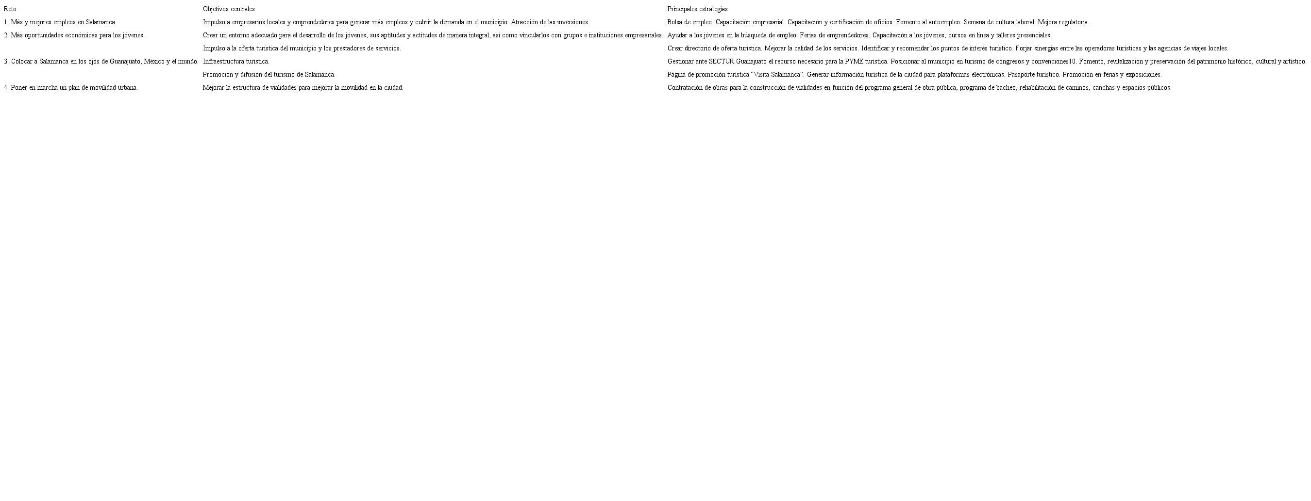 El Programa de Gobierno Municipal 2015-2018 ofrece una estructura interesante para identificar y abordar los principales problemas que aquejan al municipio de Salamanca, la cual se compone, una vez identificada la deficiencia, de retos, objetivos, estrategias e indicadores. El eje vinculado a la competitividad y a la economía, denominado Salamanca de Éxito, conformado por las áreas de desarrollo económico (retos 1 y 2), obras públicas (reto 3) y turismo (reto 4), señala problemáticas y desafíos como niveles de ingreso insuficientes en las familias, compromiso de generar más y mejores empleos (en lo general y de manera concreta para los jóvenes), lograr que el turismo constituya una mejor alternativa económica, necesidad de diversificar la economía, exigencia con relación a la mejora de la infraestructura vial (tanto en lo que corresponde a construcción como mantenimiento), así como en la calidad del transporte público. En la Tabla 6 se presentan las acciones planteadas para su tratamiento.