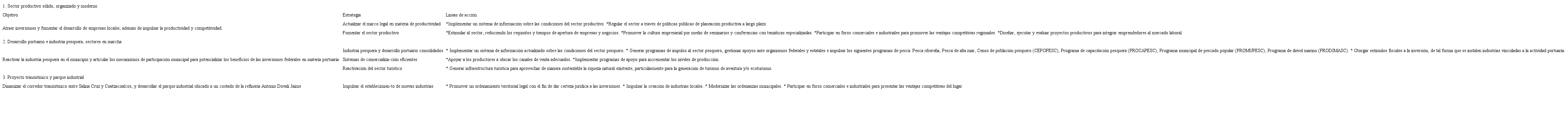 De acuerdo con lo anterior y como se observa en la Tabla 7, se definieron tres áreas de atención: 1. Sector productivo sólido, organizado y moderno, 2. Desarrollo portuario e industria pesquera, sectores en marcha (sic) y 3. Proyecto transístmico y parque industrial (Gobierno municipal de Salina Cruz, 2014).
