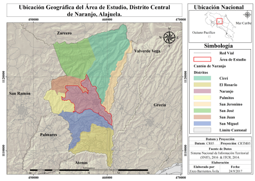 Esta contempla el distrito central del cantón de Naranjo en la provincia de Alajuela, Costa Rica (Figura 1), el cantón como tal no está tomando medidas visibles para la adaptación al cambio climático, como si lo hacen otros cantones de occidente por medio de planes de arborización urbana, además, se toma el distrito central por ser el que posee un mayor grado de urbanización. El cantón de Naranjo se ubica entre las coordenadas 10º06’23” latitud norte y 84°23’23” longitud oeste, posee una extensión de 126.62 Km2, su distrito central tiene una superficie de 16,85 Km2 y una altitud que va desde los 840 hasta los 1361 msnm y presenta una temperatura promedio entre 20 y 22 °C (Municipalidad de Naranjo, 2012, p.4).