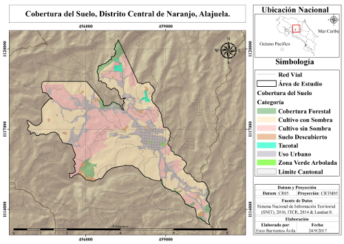 Se realizó una vectorización de la fotografía aérea Naranjo del proyecto misión Carta 2005 (Costa Rica Airborne Research and Technology Applications) para determinar los tipos de uso de suelo del distrito por medio del software ARC GIS 10.2.1® (ESRI, 2013). Al resultado de la vectorización, se le agregaron cuadriculas de 1000x1000 m, con la herramienta Cuadrícula Vectorial, del software QGIS 2.14.2 ESSEN® (QGIS Development Team, 2016); dentro de estas cuadriculas se creó un punto en el centro con la herramienta Centroides de Polígonos, dando como resultado 32 puntos, los cuales se visitaron los días 1, 2 y 3 de Agosto de 2016, para realizar comprobación de campo de la exactitud de la vectorización en parcelas de 20x20 m, con el uso de GPS Garmin Oregon 550. Se determinaron las siguientes coberturas: