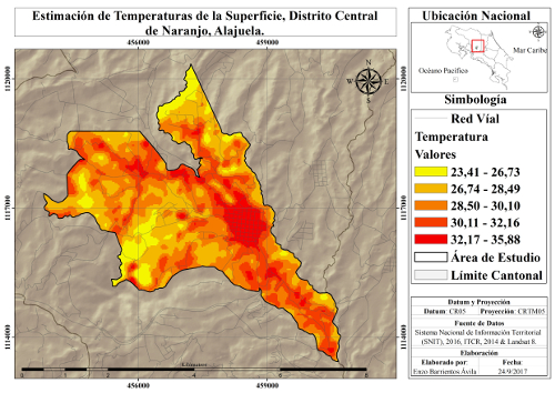 Abstract: The study aims to relate the variations in local temperatures in the central district of Naranjo, Alajuela, through the use of Landsat 8 images and Geographic Information Systems. A vectorization of the soil cover was carried out, and the areas of the different coverings were compared with the areas of the temperature ranges obtained, showing a relationship between high temperatures and urban areas and low temperatures and areas with vegetation. Showing the relationship between coverage and temperature is important to establish effective mitigation and adaptation measures in the face of climate changes and thus to avoid effects associated with urban areas such as the heat islands.