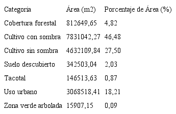 Cobertura del suelo: en total se identificaron siete distintas coberturas de suelo en el distrito central, los cuales se pueden observar en la Figura 2, con su respectiva distribución dentro del área de estudio. La cobertura de suelo con mayor extensión es el cultivo con sombra, seguido del cultivo sin sombra y el uso urbano, con menor extensión se encuentran el tacotal y las zonas verdes arboladas (Cuadro 1).