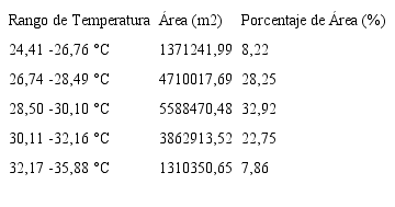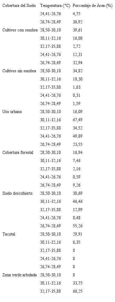 la cobertura de suelo que presentó una mayor cantidad de área dentro de los rangos de temperatura más altos corresponden al uso urbano y las zonas verdes arboladas, las cuales se encuentran dentro de las zonas urbanas, las cuales poseen la mayor cantidad de su área dentro de los rangos de temperatura de 30,11 a 32,16 °C y 32,17 a 35,88 °C; por otro lado, en cuanto al rango de temperaturas más bajo, presenta una mayor cantidad de área la cobertura forestal y en los rangos siguientes ambos tipos de cultivos. Las relaciones porcentuales entre área y temperatura se pueden observar en el Cuadro 3.