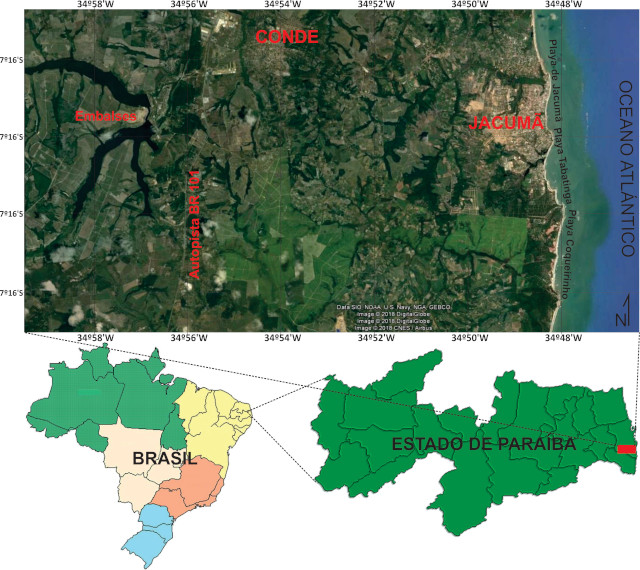 El área de estudio está localizada en la parte centro sur del litoral del Estado de Paraíba (Brasil), comprendiendo un área ubicada en las cartas topográficas de Conde y Jacumã, a escala 1:25.000. Esta área está delimitada al norte, por el paralelo 7° 15’00”; al sur, por el paralelo 7° 22’30”; al oeste con el meridiano 35º00’ W; y al este, con el Océano Atlántico (Figura 1).