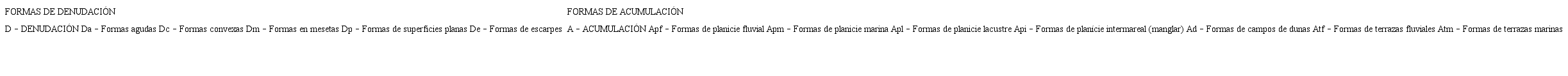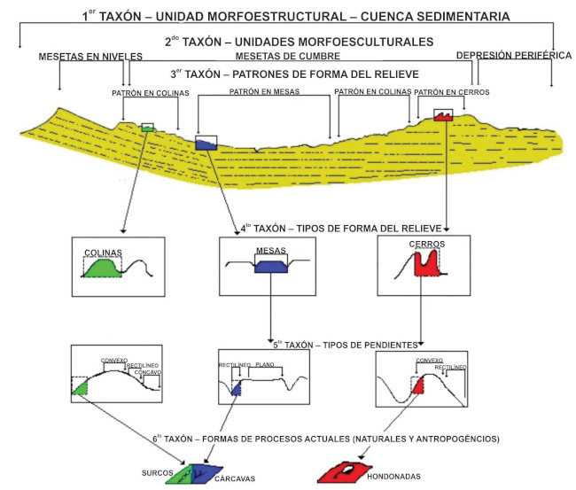 Se presenta un tercer taxón, dentro de la unidad morfoestructural y de dimensión inferior denominado Patrones de Formas del Relieve (Figura 2), este taxón hace referencia a modificaciones por procesos morfodinámicos actuales que pueden ser percibidos. Estos Patrones de Formas de Relieve pueden ser: formas de acumulación como planicies fluviales o marinas, o formas producidas por procesos denudacionales y tectónicos recientes, como, colinas, mesetas, salto de fallas, entre otros.