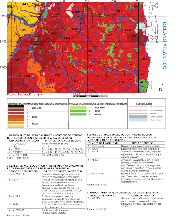 Como se puede observar en la plancha de fragilidad, existe un gran predominio de áreas para la Unidades Ecodinámicas de Inestabilidad Emergente (tonos rojos y naranjas) frente a la fuerte actuación antrópica. Al sur del casco urbano de Jacumã fueron verificadas unidades de inestabilidad emergente más fuertes, con un conjunto numérico 4553. Esta área se ubica sobre un relieve Dm 42, Espodosuelos Hidromórficos asociados a Latosoles rojos-amarillentos, suelos expuestos por el avance de la urbanización sin planificación y el comportamiento pluviométrico medio de 1.700 mm/año. Cabe resaltar que, debido a la dimensión reducida del área, alrededor 296 km2, solo se verifica un comportamiento pluviométrico de nivel medio en la escala propuesta por Spörl (2001).