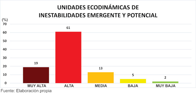 Utilizando el software libre Spring 5.4.1, fue posible cuantificar el área de cada nivel de inestabilidad potencial e inestabilidad emergente, generando datos concretos sobre cuáles son los niveles más encontrados. Añadiendo las informaciones de la plancha de fragilidad, se obtiene información de utilización práctica, tanto para uso en el ordenamiento territorial como en la planificación ambiental (Figura 5).