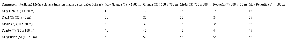 Para las formas de acumulación, se incorporaron nuevos términos que se agregan a los propuestos por Ross (1992) como formas de acumulación coluvial. Estas adaptaciones fueron necesarias, debido a la escala de trabajo utilizada, puesto que en algunos casos no fue posible separar terrazas fluviales de planicies fluviales, terrazas marinas de planicies marinas, depósitos coluviales de terrazas fluviales. Por lo tanto, se adoptaron nuevas clases de formas: terrazas y planicies marinas (Atpm), formas de depósitos coluviales, terrazas y planicies fluviales (Actpf), formas de depósitos coluviales y terrazas fluviales (Actf). Los patrones de forma de relieve se clasifican de acuerdo con la siguiente matriz, que relaciona en las columnas el grado de incisión de los valles y en las filas la dimensión interfluvial media (Figura 3).