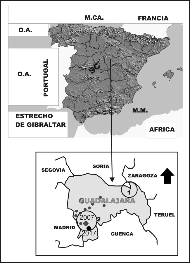 Aparecen: 1) siglas (O.A. = Océano Atlántico, M.CA. = Mar Cantábrico, M.M.= Mar Mediterráneo, SC= Montañas del Sistema Central); 2) epicentros (A) círculos mayores: gris= 07.06.2007 y negro= 20.12.2017; B) círculos grises pequeños); 3) círculos grandes con número (áreas epicentrales significativas indicadas por Cotilla y Córdoba, 2004).