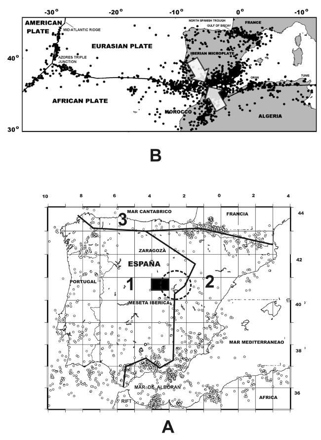 La PI (España y Portugal) es un megabloque emergido que interacciona, directamente, como parte de la placa Euroasiática con la vecina placa de África (Figura 2B). En ese proceso se generan importantes esfuerzos tectónicos (DeMets et al., 1990; Savostin et al., 1986) que se transmiten, desde el límite de contacto de las placas (Mar Mediterráneo), hacia el interior (Herraiz et al., 2000). Es en el interior de la PI donde se localiza la sismicidad de interior de placa. Para el caso de Guadalajara hay una distancia de ~500 km desde la zona de contacto.