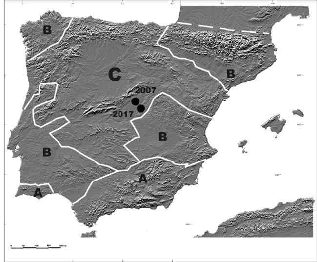 Los epicentros de Guadalajara de los años 2007 (Escopete) y 2017 (Yebra) aparecen en la figura 3 y colindan al este con la zona B. Esa zona límite es también la posición aproximada de la localidad de Brihuega, donde se produjo la serie sísmica.
