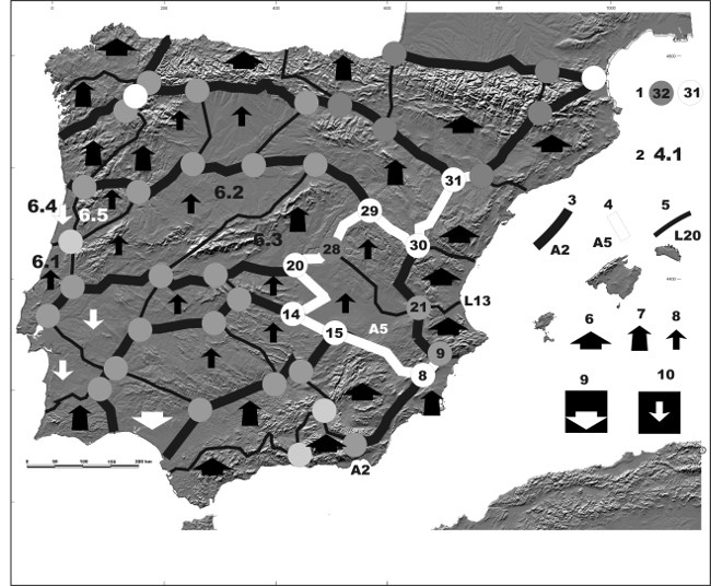 Aparecen indicados en la leyenda de la figura: 1= nudos principales (círculos con números); 2= mesobloques (4.1); 3, 4, 5= alineamientos principales (líneas irregulares de color (negro y blanco)); 6, 7, 8= zonas de levantamientos (muy activos, activos y débiles); 9, 10= zonas de descensos (muy activos y débiles).