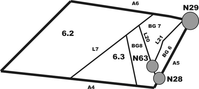 Aparecen: 1) los mesobloques (6.2 y 6.3); 2) los bloques (BG6, BG7, y BG8); 3) los alineamientos (A4, A5, A6, L7, L20, y L21); 3) los nudos de alineamientos (N28, N29, y N63).