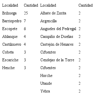 Los 130 terremotos de la provincia de Guadalajara (IGN, 2017) tienen los rangos de: 1) magnitud (mbLg) (Tabla 1); y 2) profundidad (Tabla 2); mientras que las localidades donde han sido detectados aparecen en la tabla 3. En este intervalo temporal sólo ha habido una serie sísmica (19.10.2017-06.12.2017) con 23 terremotos, en la localidad de Brihuega. La serie cubre un rango de: 1) magnitud / eventos (<1= 8, 1-2= 13, y 2-3= 2); y 2) profundidad (km) / eventos (0-10= 21, y >10= 2). Evidentemente, tales datos son típicos de una región de baja energía. Este pueblo de 296 km2 tiene 2.376 habitantes.