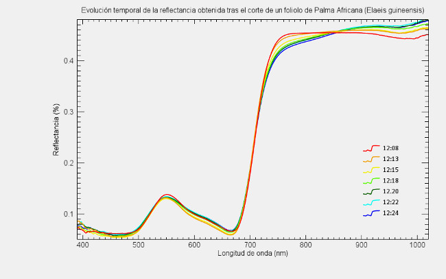 A partir de los 850 nanómetros de longitud de onda, se produce una reacción fisiológica no esperada en los foliolos recién cortados, ya que en los instantes inmediatos al corte, la reflectividad en lugar de descender (cosa que hace a partir de los cuatro minutos) se incrementa muy levemente (Figura 10). Esta mayor reflectividad proporcional al paso del tiempo en los primeros tres o cuatro minutos, probablemente corresponde al calentamiento de la hoja como consecuencia del cierre estomático, lo cual impide la pérdida de energía en forma de calor latente. Ello podría ser una respuesta defensiva de la planta, ya que se comprobó la misma respuesta en otras especies. Dicho experimento sirvió para validar la metodología de corte de foliolos en hoja de palma, ya que la esperable deshidratación y su consiguiente reflejo en la firma espectral no se producen hasta pasados cinco minutos después del corte, a pesar de las elevadas temperaturas (entre 30 y 37 ºC).
