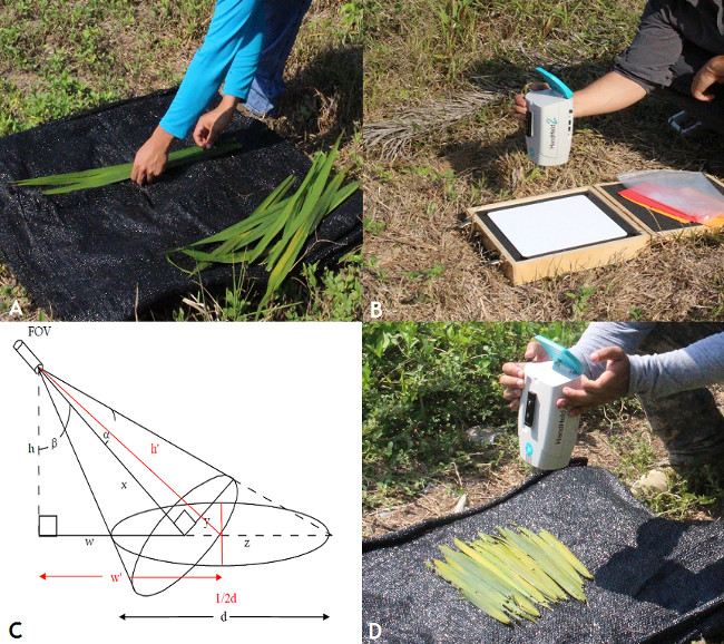 El panel blanco de referencia fue ubicado cerca de los objetos a muestrear (foliolos) y orientado para recibir toda la iluminación incidente; al mismo tiempo, se evitó proyectar cualquier tipo de sombra sobre el panel, así como la posible luz reflejada de objetos circundantes. Utilizando el sol como fuente de iluminación, se colocó el panel blanco de referencia junto a las muestras medidas y se calibró con cada muestra para que las curvas de reflectancia obtenidas fueran coherentes con la intensidad lumínica del momento de medición.