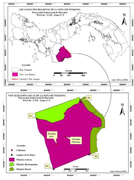 Ya citado, la investigación se lleva a cabo en la República de Panamá. El área de estudio involucra del pacífico panameño, el litoral E de la península de Azuero, del cual, el polígono de muestreo totaliza 96.2 ha de la planicie costera. Los puntos costeros que delimitan la finca se encuentran entre las coordenadas UTM - 17N/ 843046,00 / N y 604099,00 / E (P4), con 844135,00 / N y 603732,00 / E (P3); y la franja frente al litoral se extiende 1,54 km entre las coordenadas UTM - 17/ N/ 844499,00 / N y 604686,00 / E (P1), con UTM - 17/ N/ 843363,00 / N y 604862,00 / E (P2), (Figura 1).