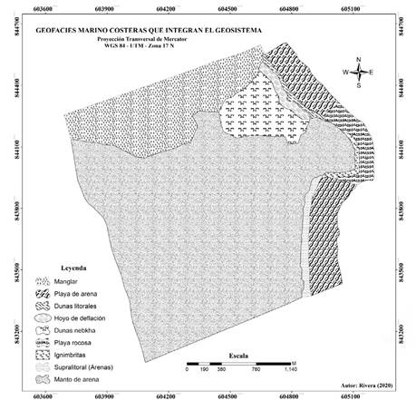 Con los datos de campo se delimita el geosistema y se elabora el mapa geomorfológico a escala 1:4 000. Se cuantifica el espacio y se identifican ocho (8), geofacies colindantes con la planicie costera, sobre la cual yace el manto de arenas (Figura 3).