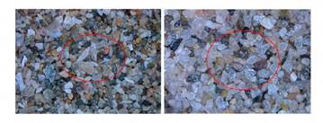 En consecuencia, auxiliados con la tabla de comparación visual (Figura 4), el análisis morfocóspico por muestreo aleatorio simple y comparado entre los clastos de cuarzo demuestra que los del mesolitoral se exhiben subangulosos -subprismático y subredondeados -subesferoidal (Coeficientes de redondez y esfericidad entre 0,5 y 0,7), mientras que los de la planicie costera son subredondeados - subesferoidal y redondeados - esferoidal (Coeficientes de redondez y esfericidad entre 0,7 y 0,9), (Figura 5).