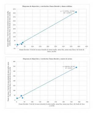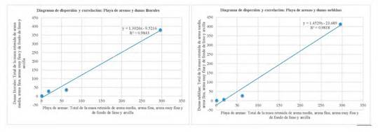 También, se utilizan las dunas litorales como variable independiente para correlacionar con las dunas nebkhas y el manto de arenas (Figura 8); en todos los casos, se determina una correlación lineal positiva de coeficiente perfecto > 0,957.