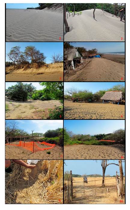 La zona de estudio expone una textura fina del relieve en un ambiente sedimentario de transición, constituido por dunas litorales, hoyo de deflación, dunas nebkhas, y finalmente mantos de arenas. La existencia de estos depósitos eólicos en climas tropicales estacionales con precipitación total anual >1500 mm, obliga a documentar los efectos morfogenéticos del viento durante el periodo seco.