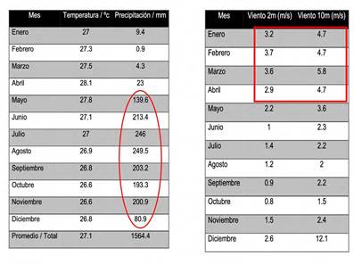 Por ende, la existencia del periodo seco acusa la necesidad de discutir sus efectos morfogenéticos, ponderando la ocurrencia de la estacionalidad climática por medio del registro de la temperatura (Mes más cálido) y el total de meses con precipitación > 50 mm (Gutiérrez, 2009, p. 445), incluyendo ahora la dirección y velocidad del viento como agente morfogenético responsable por la creación de ambientes marino-costeros de erosión y acreció.