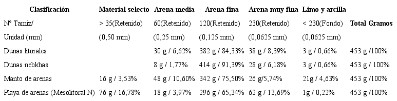 El tamaño del clasto es una de las propiedades física de mayor relevancia que se debe conocer para establecer las condiciones dinámicas que determinan el depósito de los sedimentos (Pérez y Márquez, 2017, p.21). Atendiendo los parámetros preestablecidos en la escala de Wentwoth, para clasificar por tamaño las partículas de los sedimentos (Kenitiro, 1973, p.36; Robinson, 1990, p.315; Pérez y Márquez, 2017, p.22), se realiza el análisis granulométrico por tamizado, el cual permite catalogar las muestras en tres categorías: Material selecto (constituido por conchas y materia vegetal retenidos por el tamiz Nº 35), arenas (clastos retenidos del tamiz Nº 60 al 230), limo y arcilla (todas las partículas de fondo que traspasaron el tamiz 230) (Tabla 2).