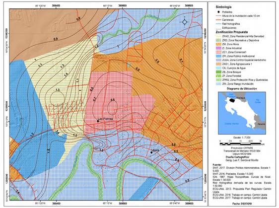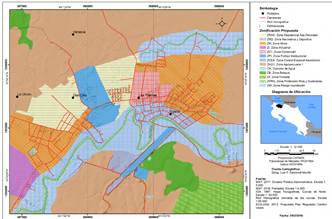 Esta situación, llevó a proponer en el reglamento de zonificación, restringir las nuevas construcciones en las áreas con amenaza de inundación, trasladar los edificios de instituciones públicas a zonas seguras y en la medida de lo posible ir trasladando el área comercial del distrito central de ese cantón hacia las áreas seguras de la ciudad (ECG-UNA, 2012b) (Mapa 3).