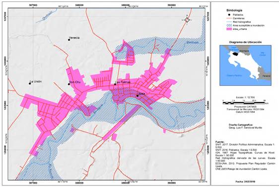 Abstract: There has been speculation among public opinion television programs regarding the hypothetical benefits that the proposed Territorial Regulatory Plan of the canton of Upala, prepared by the School of Geographical Sciences of the Universidad Nacional, could have had if it had been approved a few years before the passage of Hurricane Otto. This article describes the scope that said plan had in terms of restricting land use in the then considered flood susceptible areas, but not before performing a historical environmental analysis of the relationship existing between the community of Upala and the Zapote River. Additionally, through the gathering of field evidence and the use of geographic information systems (GIS), it was possible to reconstruct reached water levels and relate flooding behavior to the city’s distribution and the forecasts made in the Territorial Regulatory Plan. Results indicate that the behavior of this extreme natural event was not foreseen thus causing a strong impact in areas previously zoned and approved for residential and governmental use. This experience invites to reflect on the need to consider climate change in territorial planning.