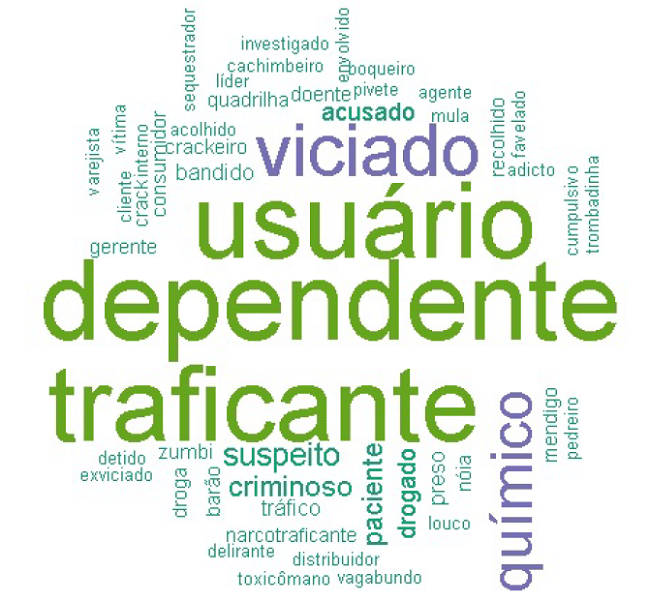 Em relação a visão sobre as pessoas envolvidas com o crack, foram encontrados 38 termos diferentes que faziam referência a esta população, podendo ser visualizados na figura 1 (quanto maior o tamanho do termo na figura, maior a sua frequência de uso nas notícias). Apesar dos termos mais empregados serem "usuário" e "dependente" (e suas variações), devido a maior frequência de notícias sobre ações policiais de cunho repressivo grande parte dos termos encontra-se relacionada a esses cenários, como "traficante", "criminoso", "bandido", dentre outros. Ainda de acordo com a figura, observa-se um grande número de termos pejorativos e estigmatizantes.