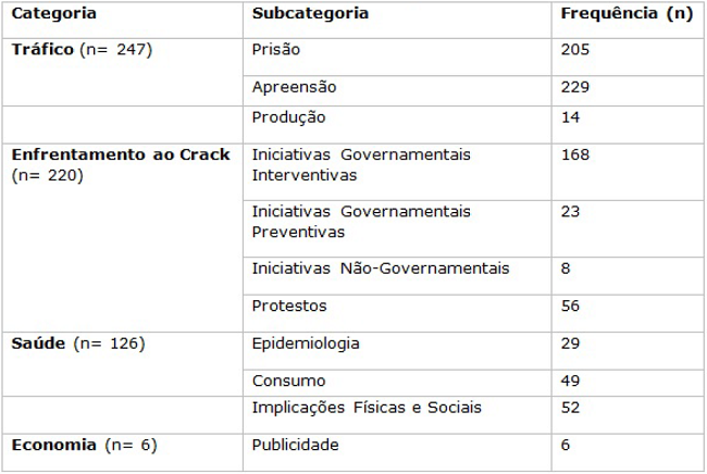 Foram encontradas 661 notícias na revista A, 139 na B e 175 na C. Nesta última, a busca foi feita até abril de 2012, pois as notícias após este período não estavam disponíveis online no momento da coleta de dados. Na etapa seguinte, deu-se início às análises das notícias com base nos seguintes critérios de inclusão: (a) notícia não ser duplicada; (b) a palavra "crack" sendo utilizada como referência à substância psicoativa, e (c) ser a substância crack o tema central retratado na notícia. A partir da leitura inicial, foram excluídas 416 notícias que não preenchiam os critérios de inclusão. Assim, a amostra final consistiu-se de 377 notícias na revista A, 53 na B, e 129 na C, correspondendo a um total de 559 notícias.