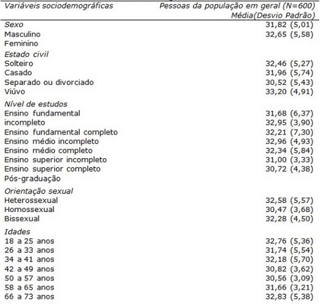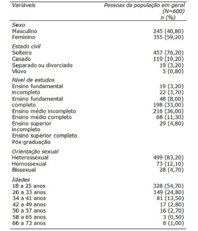 Contou-se com 600 pessoas adultas da população em geral, de ambos os sexos, sendo 59,2% mulheres e 40,8% homens, com idades compreendidas entre 18 e 73 anos (Média de idade = 27,31, Desvio padrão = 9,37). Por favor, verificar na Tabela 1 a caracterização dos participantes desta pesquisa.