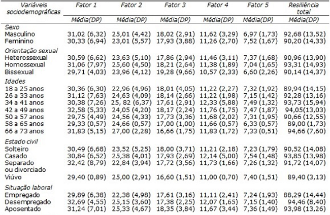 A partir dos dados obtidos, pode-se observar a existência de associação entre as variáveis psicológicas e alguns dados sociodemográficos. No que se refere à resiliência, foram encontradas diferenças estatisticamente significativas em função das seguintes variáveis sociodemográficas: sexo, escolaridade, situação laboral, iniciação sexual e realização do teste de HIV. As demais variáveis sociodemográficas apresentaram relação em apenas alguns fatores da escala de resiliência. Dessa maneira, observa-se que, no contexto piauiense, ser mulher, ter baixa escolaridade, estar desempregado, nunca ter tido relações sexuais e nunca ter feito o teste de HIV/AIDS são fatores associados a níveis mais baixos de resiliência.