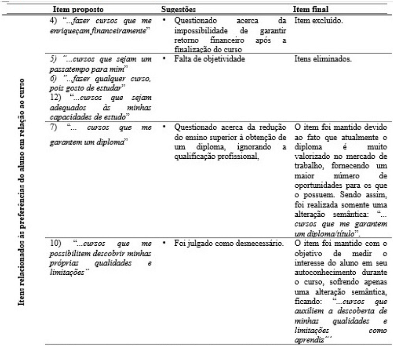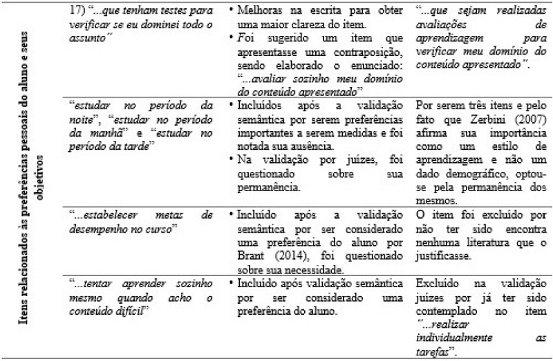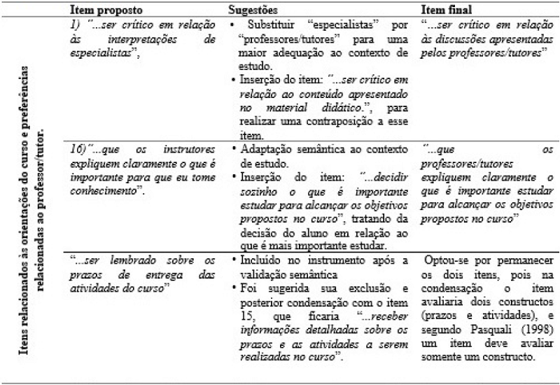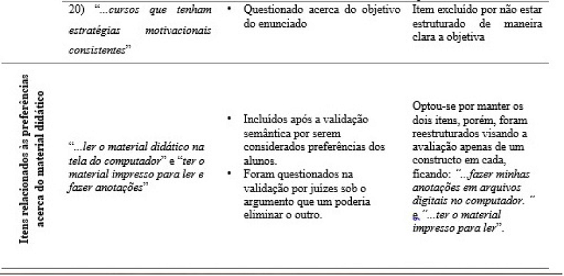 A frase que orienta o preenchimento do instrumento, antes colocada como "para estudar em cursos de ensino superior à distância, eu prefiro..." não recebeu nenhuma crítica na validação semântica, porém, na validação por juízes, foi sugerido que se retirasse o "ensino superior", pois toda a amostra será composta por estudantes desse grau de escolaridade, além de diminuir a frase e torna-la mais dinâmica para a leitura e compreensão. Ficando, portanto, "para estudar em cursos à distância, eu prefiro...". As alterações propostas no processo de validação semântica e por juízes possibilitaram o aprimoramento e a adaptação da escala de medida em questão, que passou a ser constituída por 27 itens.