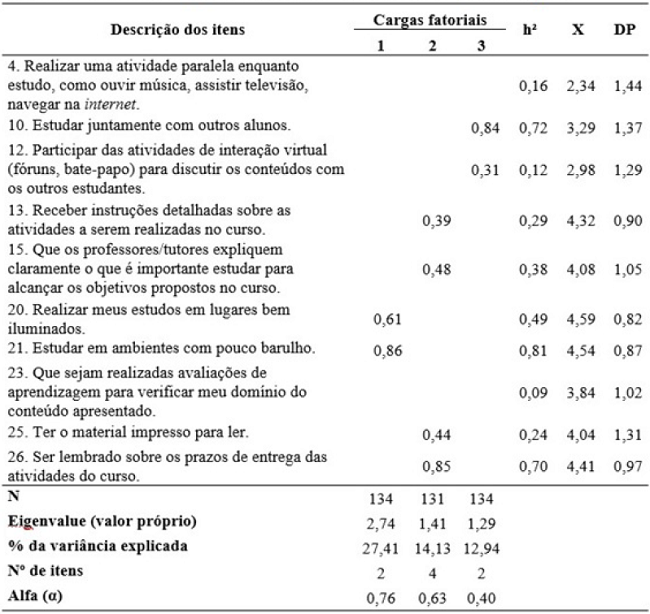 O instrumento de Estilos de Aprendizagem possui 10 itens e é formado por 3 fatores que foram chamados de: Fator 1 "Ambiente de Estudo", Fator 2 "Regulação Externa" e Fator 3 "Interação Interpessoal". O item 23 "Que sejam realizadas avaliações de aprendizagem para verificar meu domínio do conteúdo apresentado" não permaneceu na estrutura por não possuir carga fatorial igual ou maior que 0,30, positiva ou negativa. O item 4 "Realizar uma atividade paralela enquanto estudo, como ouvir música, assistir televisão, navegar na internet" inicialmente foi incluso no fator 1, denominado "Ambiente de Estudo". Porém, ao realizar o cálculo de confiabilidade, o valor do Alfa apresentou um valor negativo, e foi indicado que o mesmo teria seu valor alterado caso esse item fosse retirado do fator. Sendo assim, optou-se por sua exclusão do instrumento.