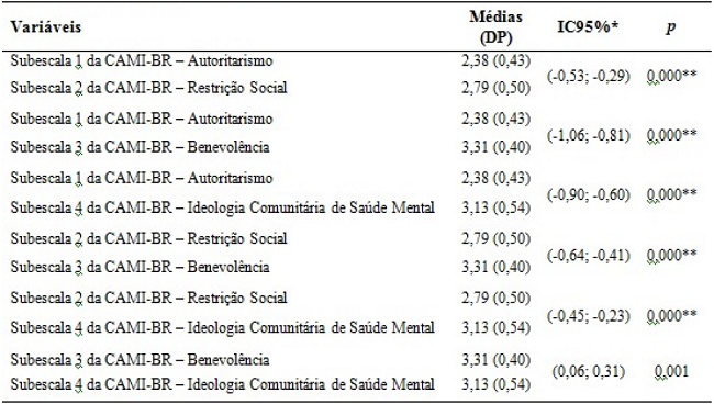 Os resultados das comparações entre as subescalas, por meio da análise de variância ANOVA de medidas repetidas, indicaram diferenças significativas (F = 153,61; p < 0,001). O teste post hoc de Bonferroni mostrou que todas as subescalas eram significativamente diferentes entre si, tendo em vista que nenhum dos intervalos de confiança (IC95%) continha o valor zero. As atitudes dos sujeitos se mostraram mais positivas na subescala de Benevolência (envolvimento e responsabilidade da sociedade), quando comparadas às subescalas de Ideologia Comunitária de Saúde Mental, de Restrição Social e de Autoritarismo. Por outro lado, atitudes mais negativas foram observadas na subescala de Autoritarismo (hospitalização e tratamento coercivo), quando comparada à de Restrição Social, de Benevolência e de Ideologia Comunitária de Saúde Mental (Tabela 1).